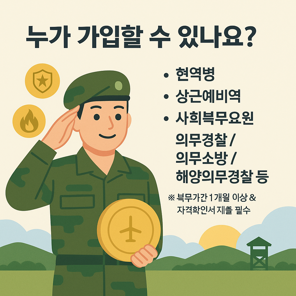 현역병뿐 아니라 사회복무요원, 의무경찰, 의무소방원 등도 가입 가능합니다.