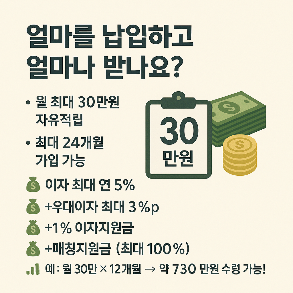 | 1% 이자지원금 | 납입금별 예치일수에 따라 1% 추가 지원 (만기 시) |