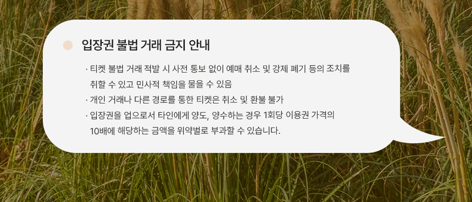 티켓 불법 양도, 거래 적발 시 예매 취소 및 민사상 책임이 따를 수 있습니다.