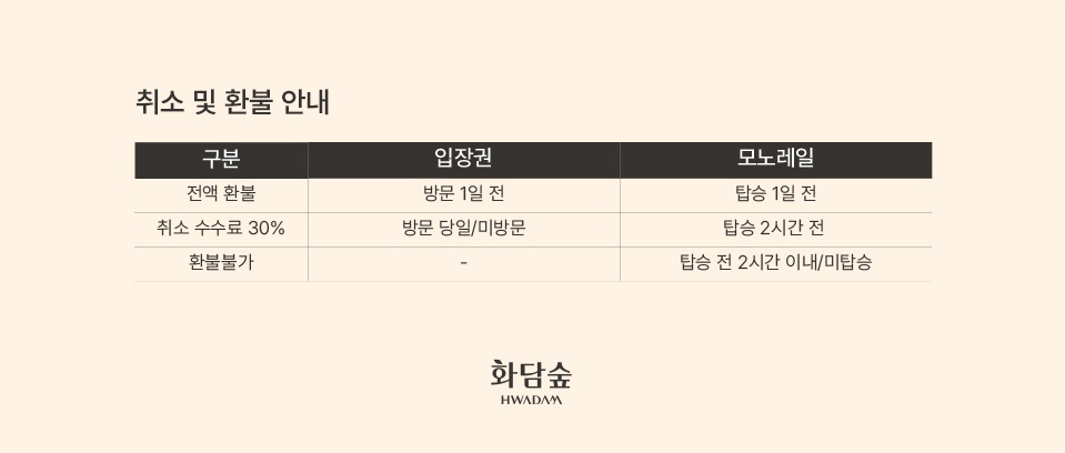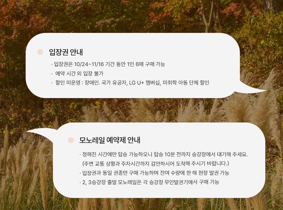 | 모노레일 탑승권 | 1승강장 출발 시간 예약제 | 2,3승강장은 현장 무인발권기 이용 가능 |