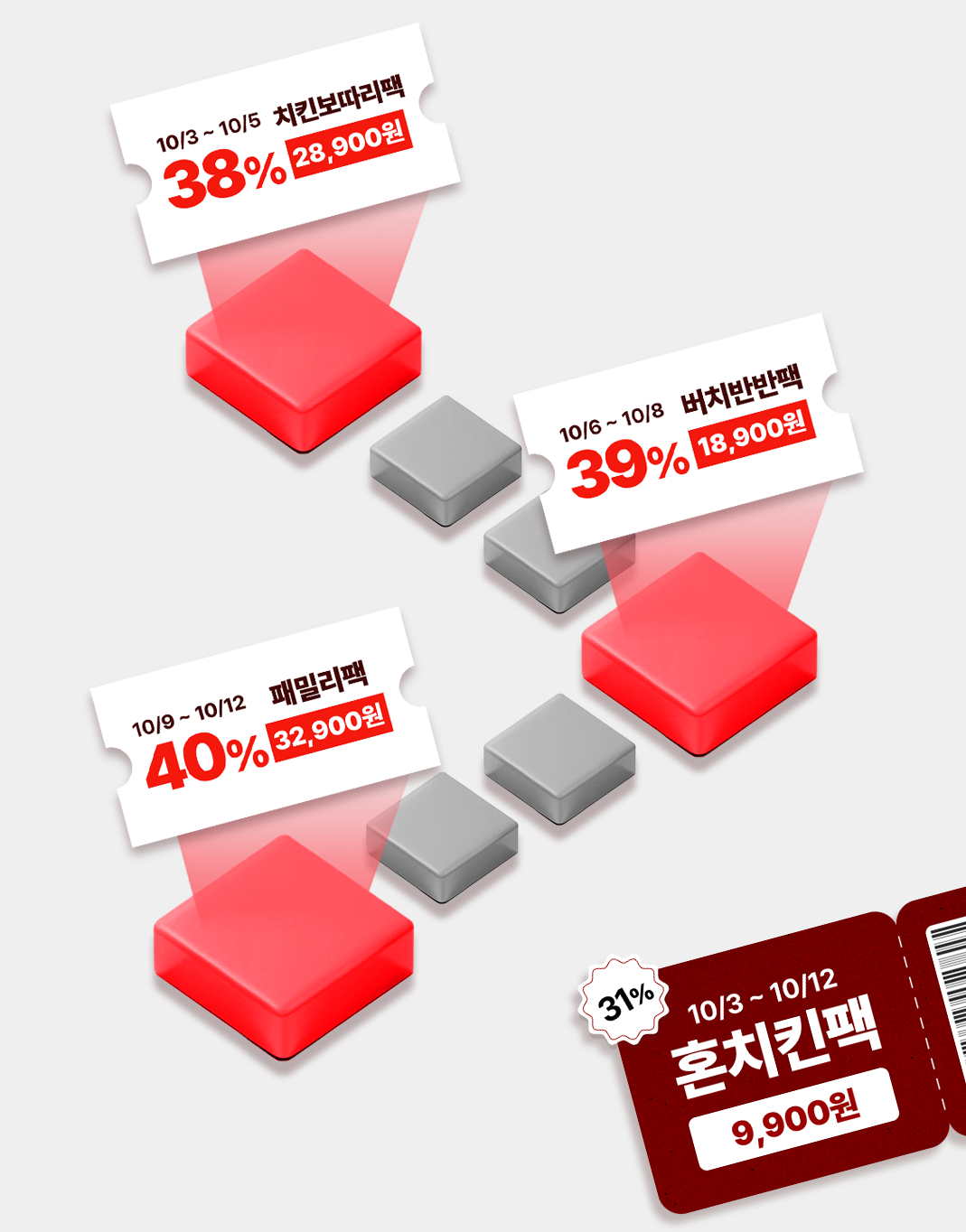 | 치킨보따리팩 | 10/3 ~ 10/5 | 핫크리스피 5 + 갓양념치킨 5 + 사이드 & 콜라 3 | 28,900원 |