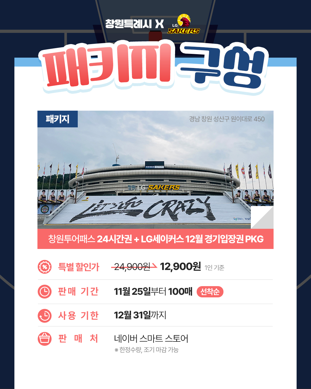 창원투어패스 24시간권 1매와 LG세이커스 홈경기 일반석 입장권 1매로 구성된 12,900원짜리 한정판 관광 상품입니다.