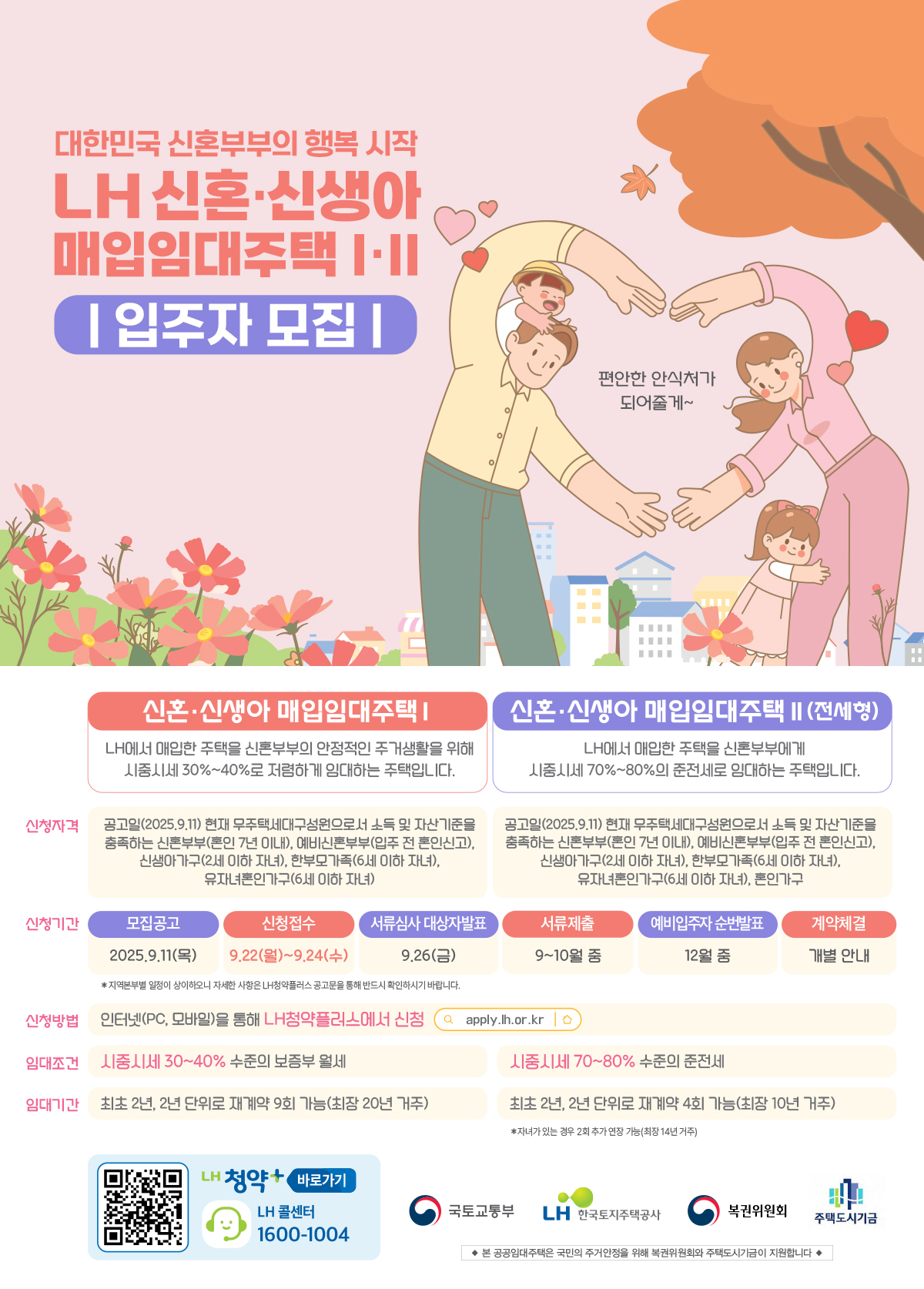LH는 2025년 3차 신혼·신생아 매입임대Ⅰ·Ⅱ(전세형) 예비입주자를 모집합니다. 이번 사업은 젊은 세대의 주거 안정을 돕고, 출산 및 육아 가정의 경제적 부담을 줄이기 위해 추진됩니다.